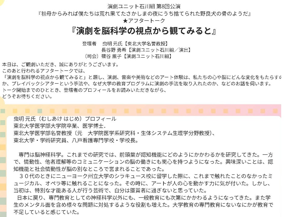 2025年10月31日に行われた石川組の演劇「祖母からみれば僕たちは荒れ果てたさかしまの夜に捨てられた野良犬の骨のようだ」のアフタートークに出演しました。司会の篠谷さんにガイドされながら、演出をされた長谷野さんと、30分のトークは貴重な体験でした。会場のTHEATERえびすは地下鉄の広瀬通駅近くで、こじんまりとした劇場ですが、それゆえに演じる方との距離が近く、まるで自分も演劇の中にいるような錯覚をもつほどに臨場感ある演出でした。A.クリストフ「悪童日記」を日本の舞台に置き換え、描かれた虐待、貧困、暴力、社会のひずみは、現代のわれわれの心にも突き刺さるテーマで、演じられた方の気迫が感じられる体験でした。
